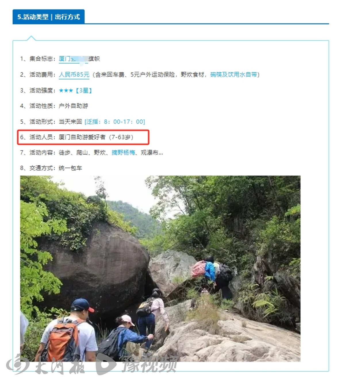该招募信息显示,活动地点位于安溪县龙门镇溪瑶村,为户外自助游,7到63岁人员均可参加,通过添加组织者的微信报名,活动费用为85元(含来回车费、5元户外运动保险、野炊食材、碗筷及饮用水自带),5月25日从厦门出发,当天往返,活动内容包含徒步、爬山、野炊、摘野杨梅、观瀑布等。