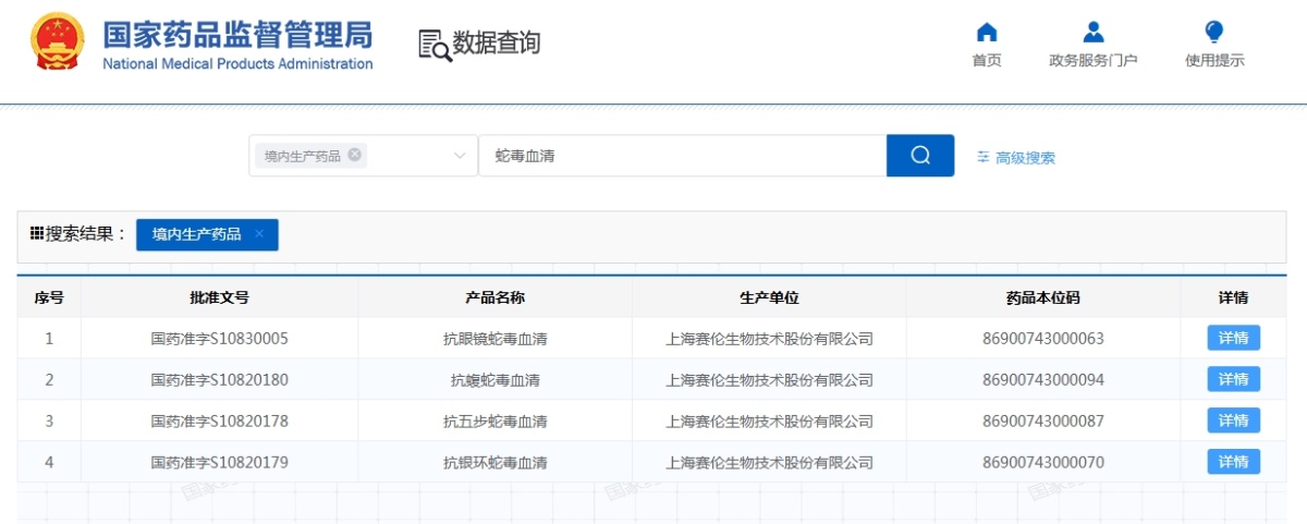 6月4日,大河报记者从国家药品监督管理局官网查询发现,我国境内能够生产抗蛇毒血清的,只有赛伦生物一家公司,其获批登记在册的共4种抗蛇毒血清,分别是抗眼镜蛇毒血清、抗蝮蛇毒血清、抗五步蛇毒血清、抗银环蛇毒血清。
