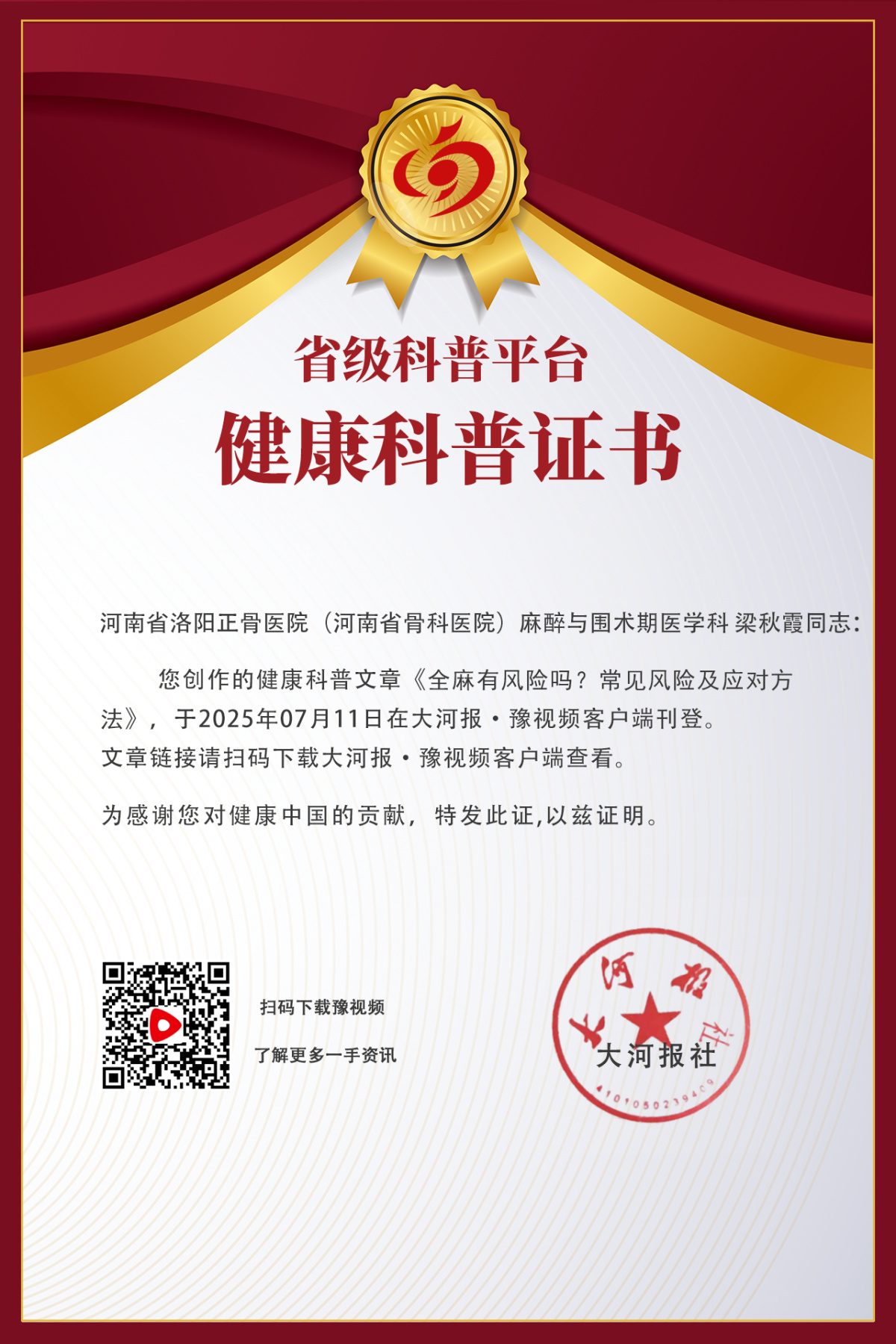 全麻风险虽客观存在,但通过规范的术前评估、术中监测及术后管理,可大幅降低并发症发生率。 河南省洛阳正骨医院(河南省骨科医院) 麻醉与围术期医学科 梁秋霞