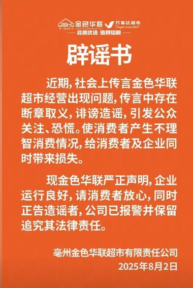 8月2日,亳州金色华联超市有限责任公司在官微上发布的辟谣书称,“近期,社会上传言金色华联超市经营出现问题,传言中存在断章取义,诽谤造谣,引发公众关注、恐慌,使消费者产生不理智消费情况,给消费者及企业同时带来损失。现金色华联严正声明,企业运行良好,请消费者放心,同时正告造谣者,公司已报警并保留追究其法律责任。”