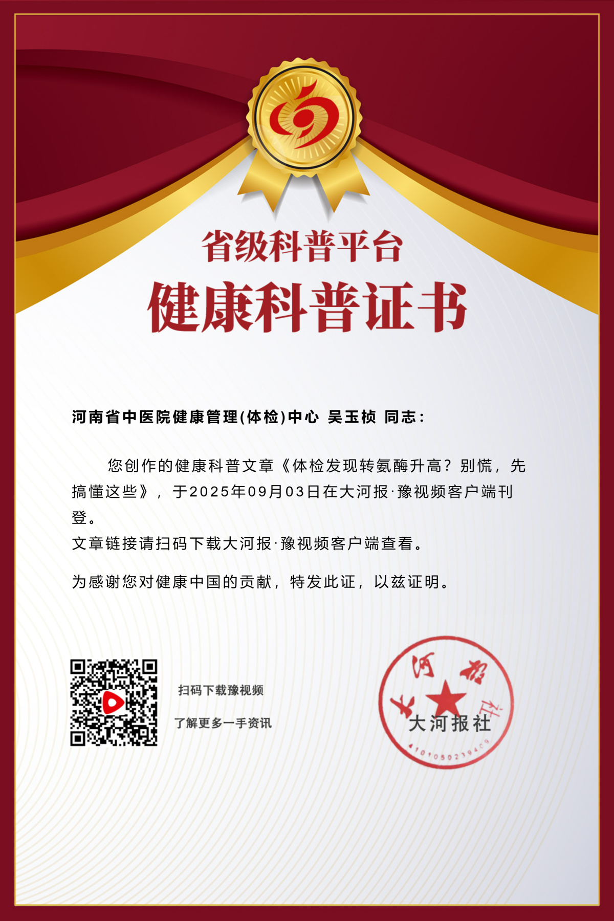 转氨酶升高是提醒,多数轻度升高通过调整习惯可恢复,别过度焦虑,也别掉以轻心,及时排查、科学养护,才能守护肝脏健康。(河南省中医院健康管理 体检中心 吴玉桢)