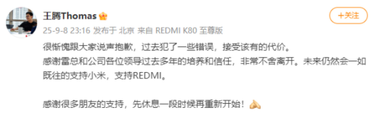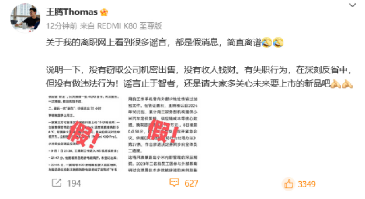 9月9日上午,王腾在个人微博账号发文辟谣了关于自己离职原因的相关谣言。