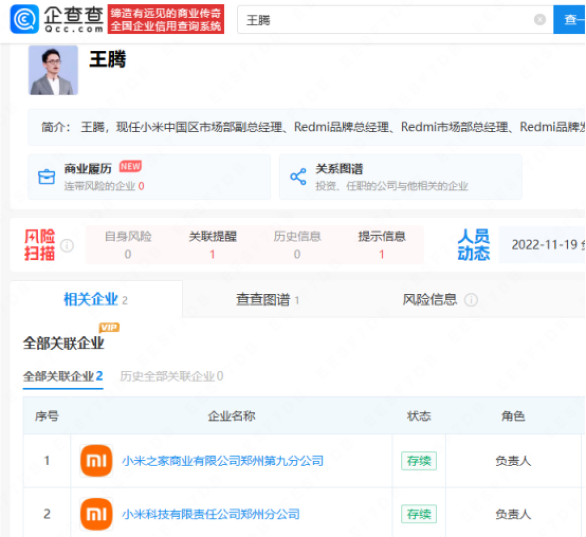 记者了解到,王腾目前仍关联有小米之家商业有限公司郑州第九分公司、小米科技有限责任公司郑州分公司。
