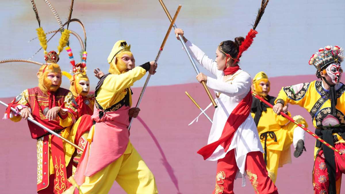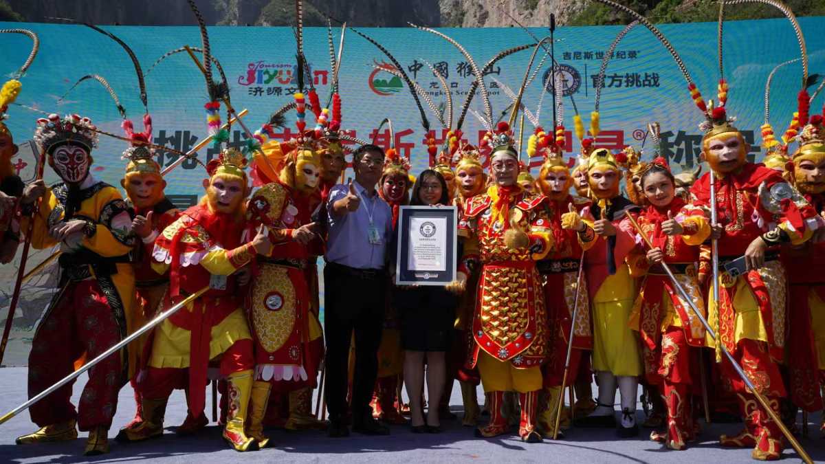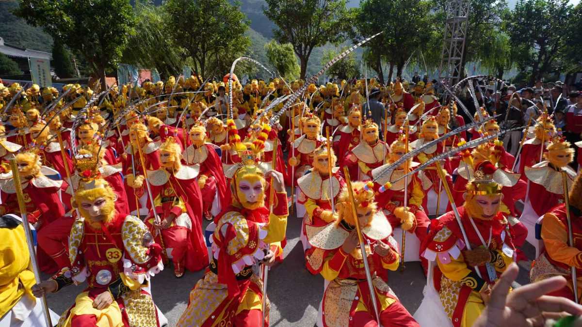 开幕仪式后,五龙口景区桃都山迎来了挑战吉尼斯世界纪录活动。众多“孙悟空”扮演者手持金箍棒,伴随旋律齐舞。经吉尼斯认证官现场确认,成功挑战“最多人装扮成孙悟空聚会”世界纪录。不少游客在场观看,共同形成“万人共忆西游”的热闹场景。