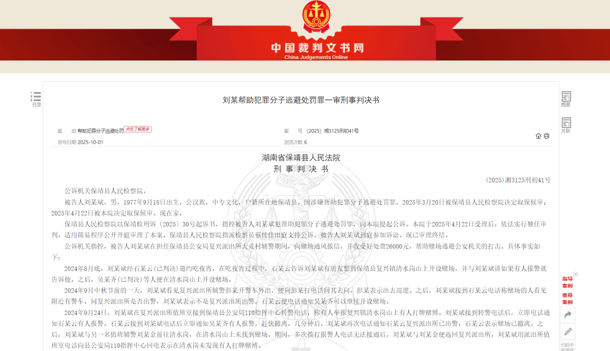 辅警刘某斌收受2.6万元好处费,出警前打电话为赌场通风报信获刑。10月1日,中国裁判文书网公开了该案的判决书,湖南省保靖县人民法院一审判决刘某斌有期徒刑一年,缓刑两年。