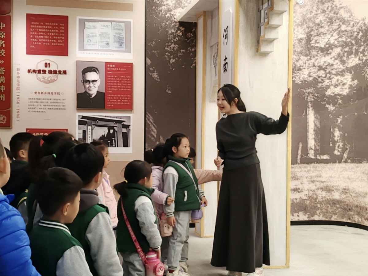 为了让抽象的“百年”变得具体、厚重的历史变得鲜活,讲解员们特意将学校发展脉络拆解为9个趣味闯关环节,每一处设计都经过“儿童视角”的反复校验:把“1923年创办”“1956 年更名新乡师范学院”等关键年份印成彩色“时光脚印”;将战乱中办学的艰辛凝练成“迁徙小侦探”沙盘模型;把校徽文化融入“寻宝”游戏……这份专属设计,从萌娃们对着“时光脚印”好奇打量、在校史浮雕前专注寻找太行山与黄河图案的瞬间,便抓住了孩子们的心。“我们想让校史不是‘高高在上’的陈列,而是能‘弯下腰’和孩子对话的朋友。”讲解员司若涵笑着说。
