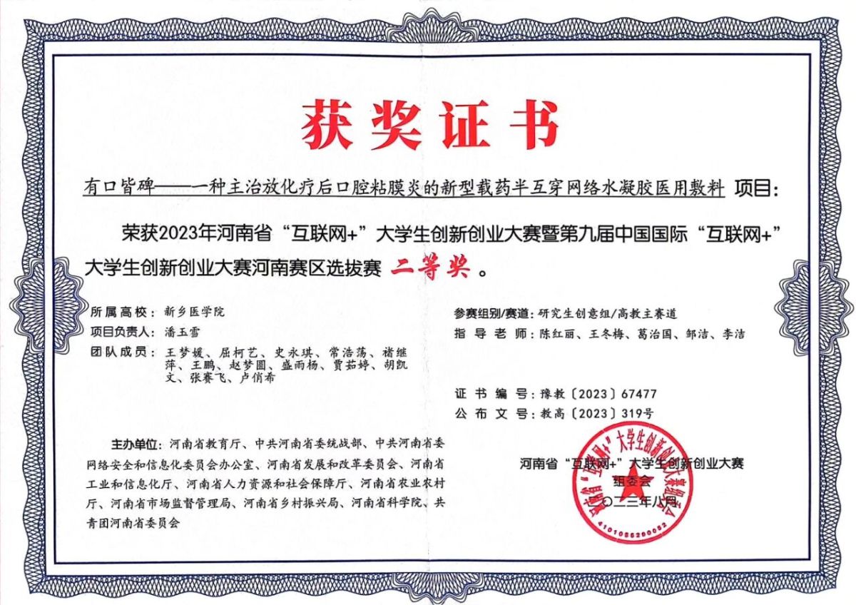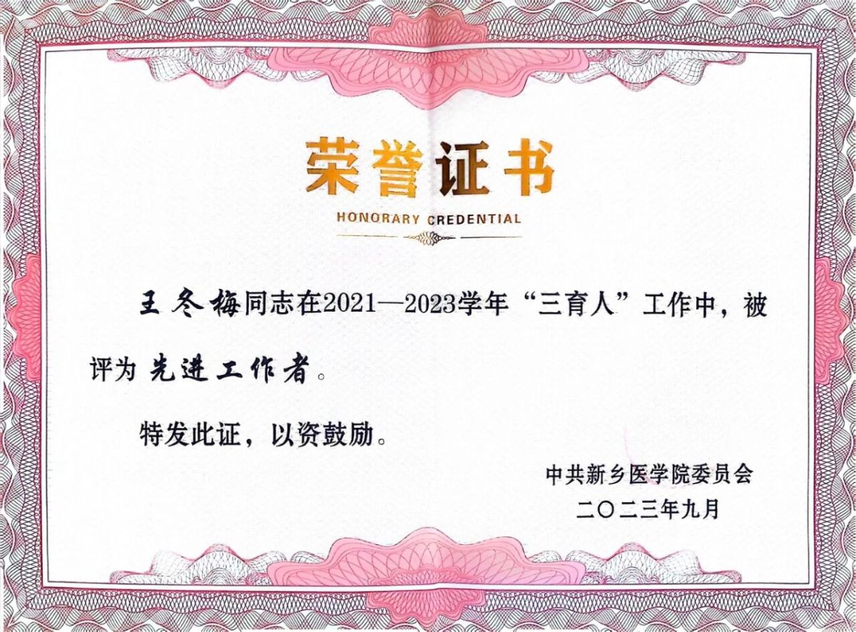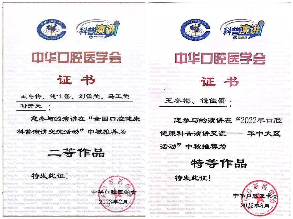 在她的指导下,学生团队在河南省“互联网+”大学生创新创业大赛中获二等奖,多项校级科技创新课题立项。她本人也被评为中国牙病防治基金会首批口腔健康推广大使,“三育人”先进工作者,多次获得校级优秀教师,大学生技能大赛优秀指导老师,河南医药大学第三附属医院最美教师等荣誉。