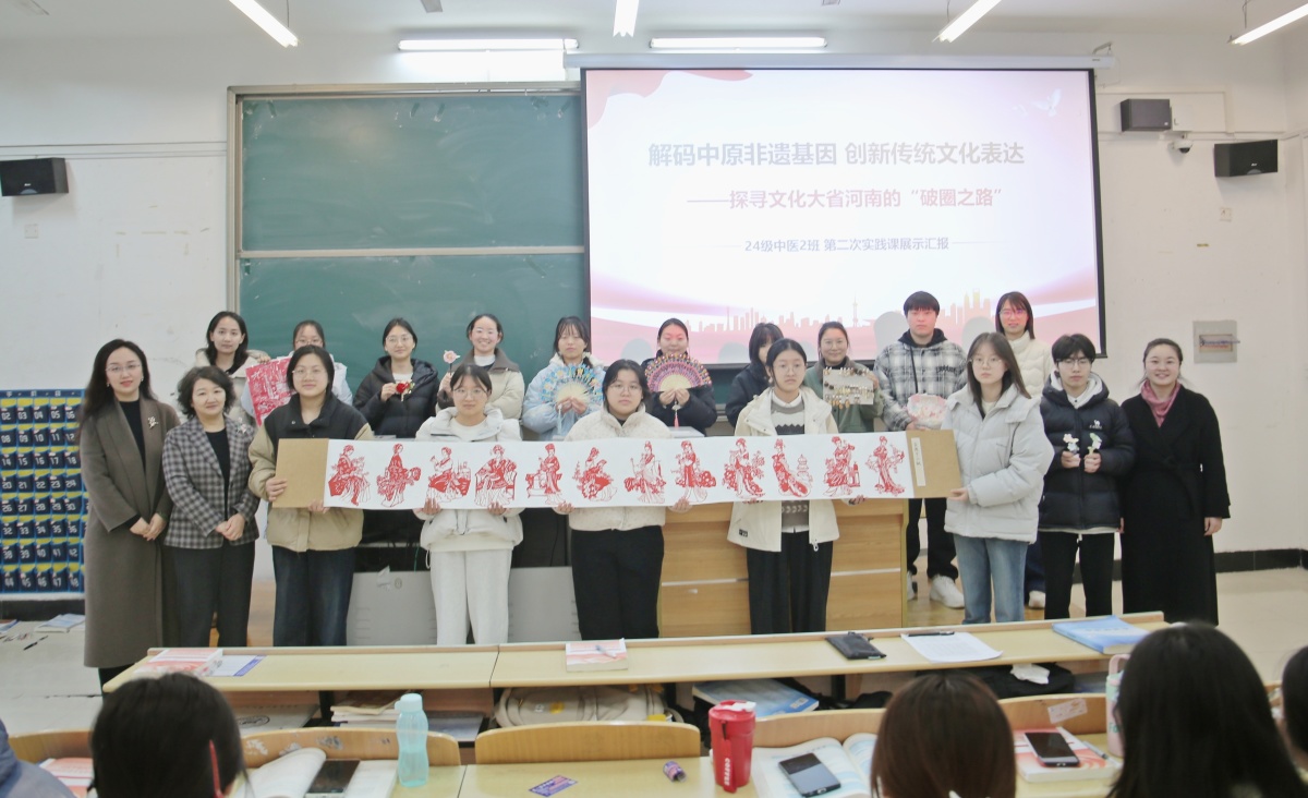 本次实践课以“解码中原非遗基因 创新传统文化表达——探寻文化大省河南的‘破圈之路’”为主题,核心环节聚焦学生成果展示。课堂上,各学生小组依次呈现非遗刻纸创作、中药手串与中药耳饰制作等实践成果:非遗刻纸小组以“红色经典场景”“健康中国图景”为创作核心,通过精细刻工展现传统文化与时代主题的深度融合;中药文创小组则结合专业所学,详细讲解了中药手串、耳饰的药材选取标准、功效原理与文化寓意,分享了将中医药知识与传统手工艺有机结合的创作思路。展示过程中,学生们还通过实物陈列、制作流程演示、创意理念阐述等多元方式,生动诠释了对“非遗传承与文化自信”“专业特色与文化创新”的深刻理解,课堂互动氛围热烈,充分彰显了实践课“以学为主、以展促思”的育人特色。