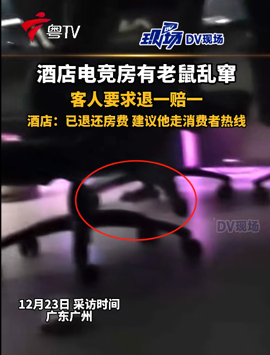 12月23日,据媒体报道,近日,周先生和朋友在广州一家酒店入住发现老鼠乱窜,要求涉事酒店退一赔一遭到拒绝,涉事酒店回应:建议走消费者热线。