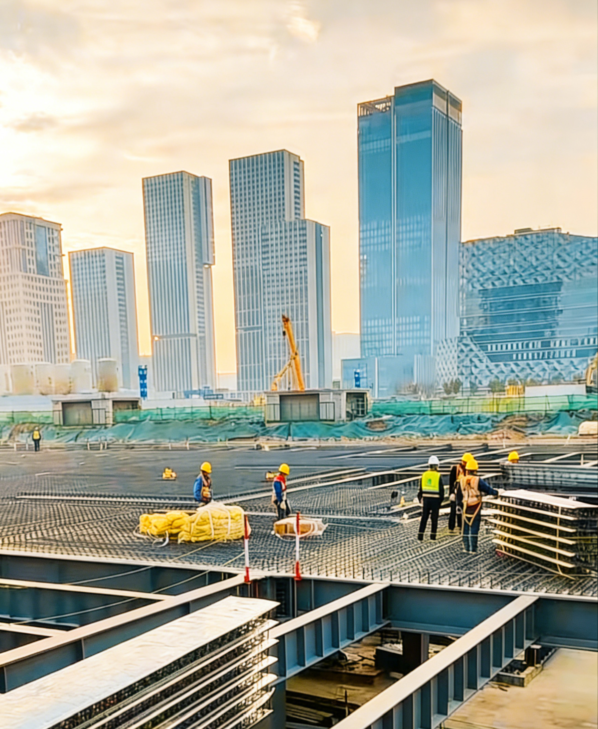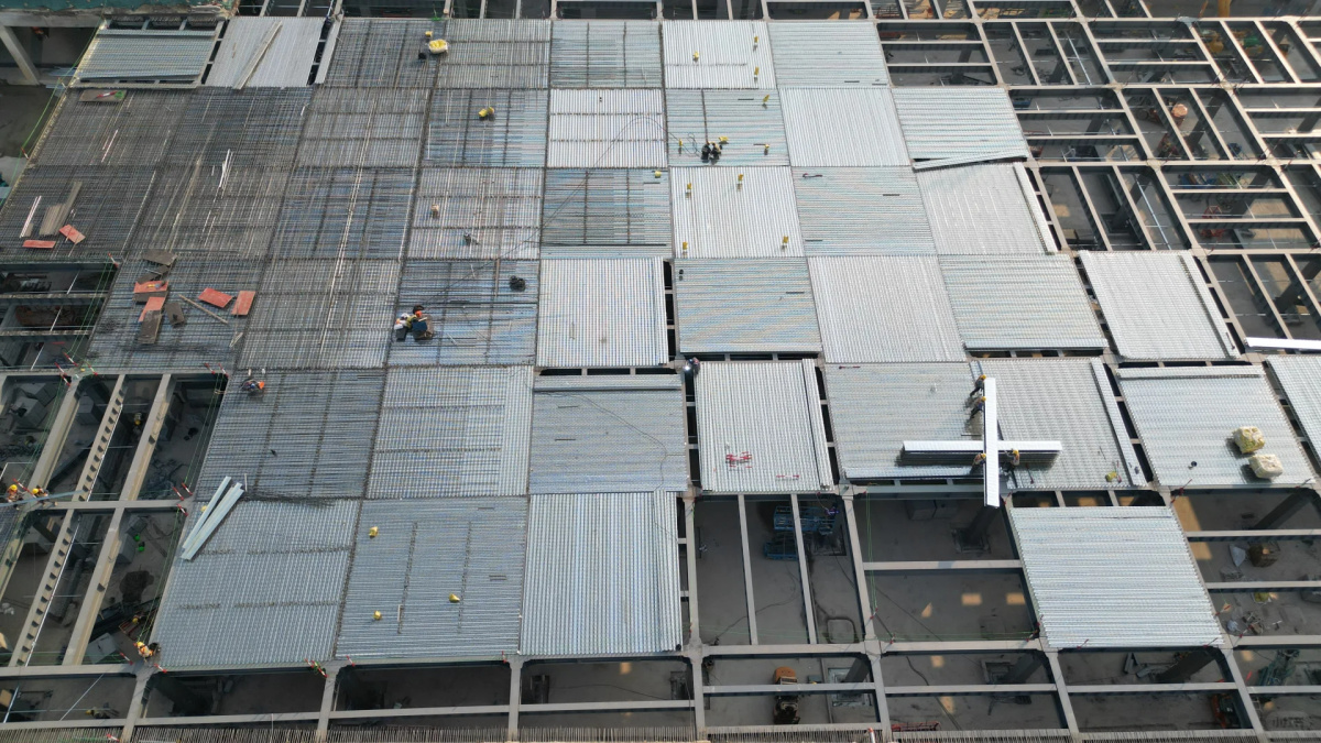 记者在今日探访中发现,施工进度有了明显更新:这些钢柱上方已经全面铺设了钢筋桁架楼承板。除了极少数位置尚未铺完,整个建筑主体已经基本完成了“封顶”。