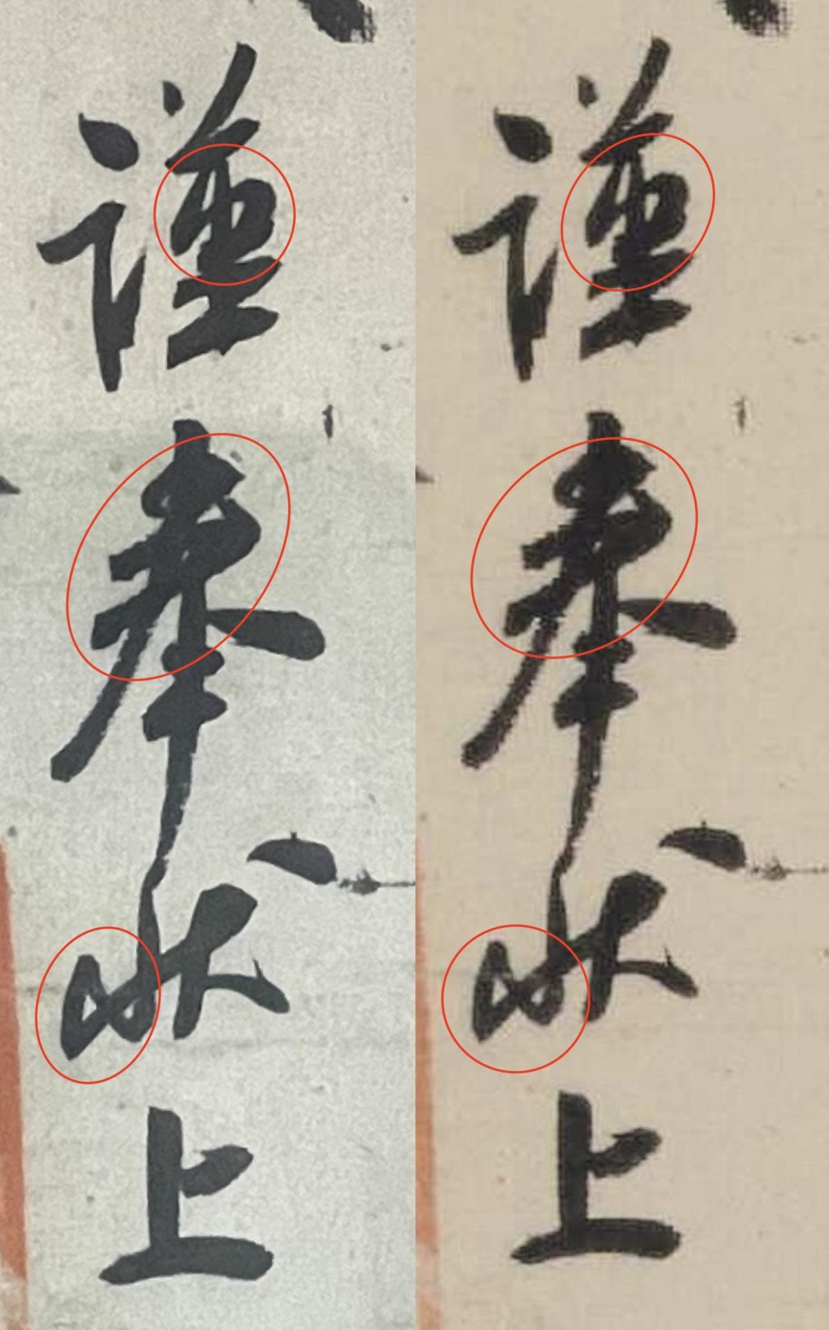 大雨廔提供的米芾《行书三札卷》 对比图,左边为现场拍摄图片,右边为故宫博物院公开图片