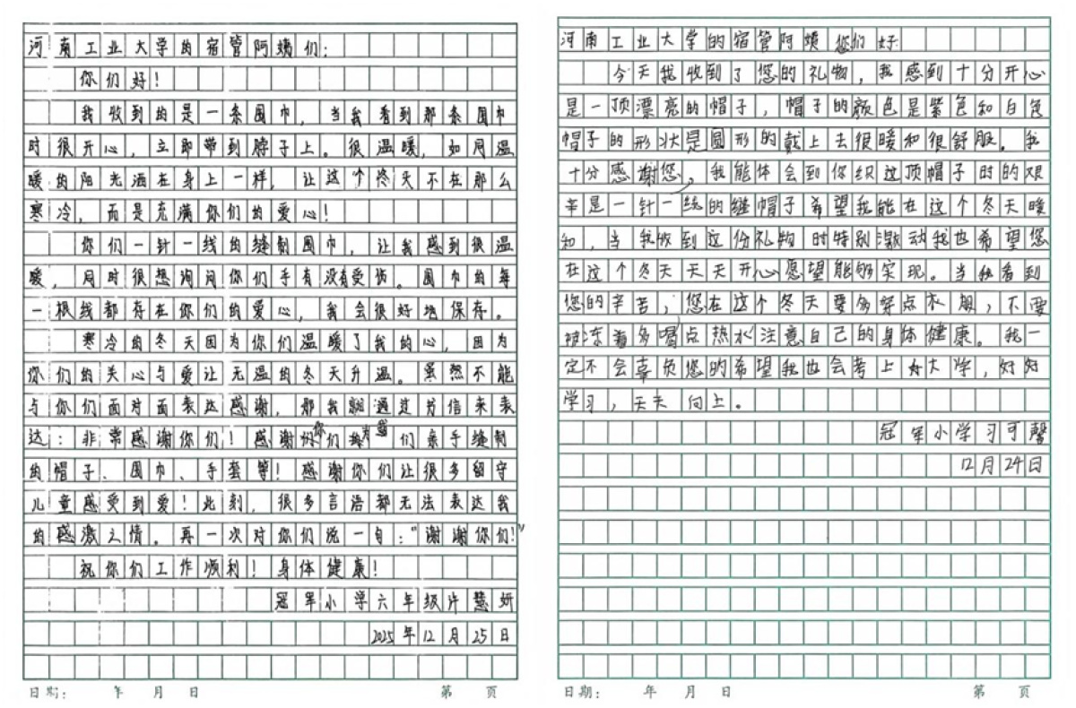 12月26日,“宿妈”们收到了60余封孩子们用稚嫩笔迹书写的感谢信,字里行间满是穿上身的温暖与融入心的感动。她们说,这些书信让她们倍感欣慰,也更坚定了将这份温情持续传递下去的心意。
