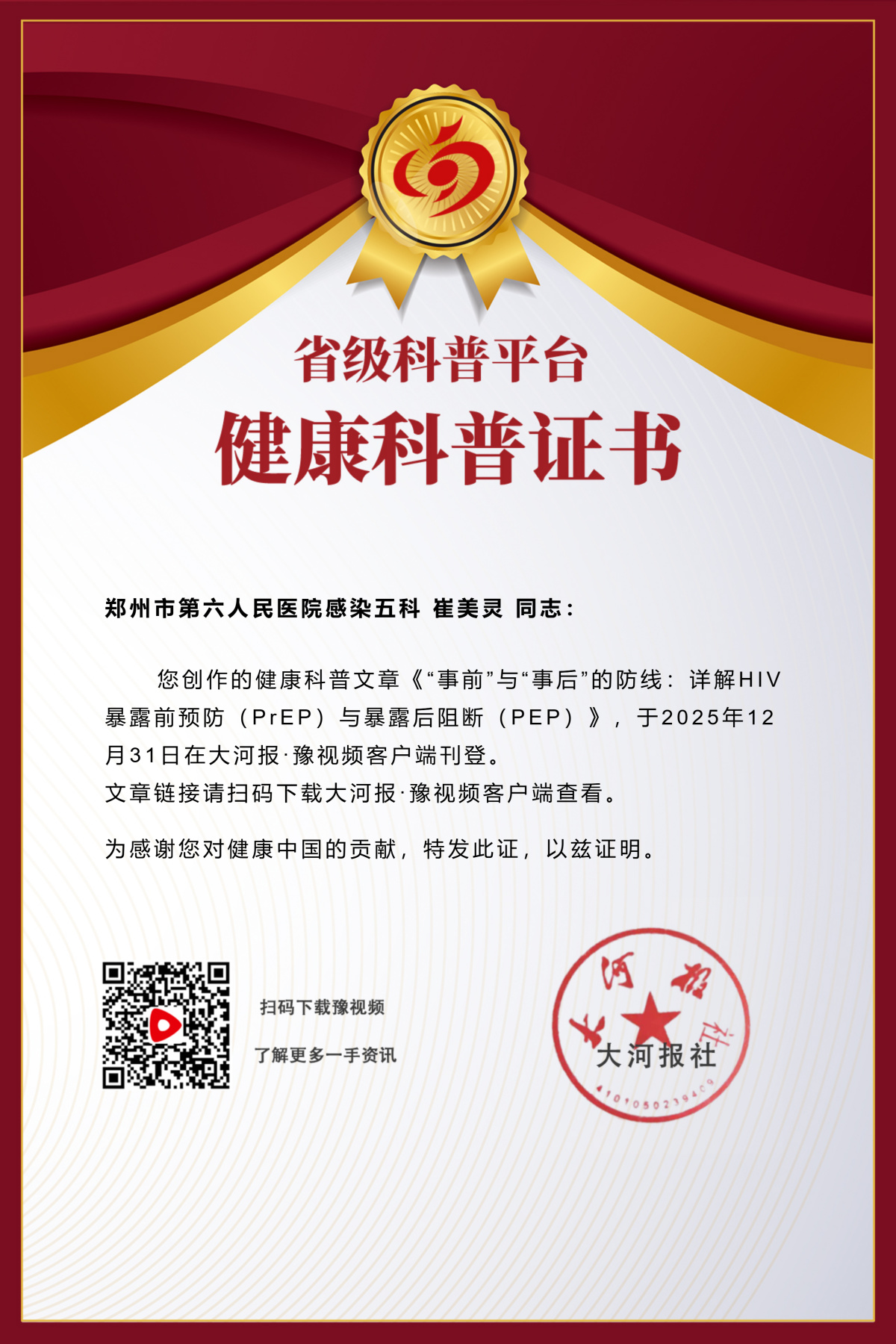 在艾滋病防治的道路上,知识本身就是最有效的疫苗之一。通过理解并善用“事前”与“事后”的这两道防线,我们不仅能够更好地保护自己,也在为建立一个零歧视、零新发感染的世界贡献力量。(郑州市第六人民医院感染五科 崔美灵)