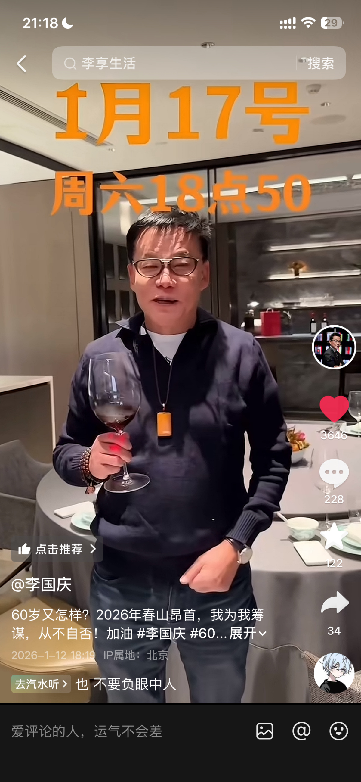 16日晚7点左右,李国庆在社交媒体平台上发布视频,喊话贾国龙:“西贝别关了!我来想办法!我出钱,我带头,我们重整公司……不是信口开河啊,我还有一个消费基金,不用跟老婆商量”。1月12日,60岁的李国庆曾预告称,1月17日将直播带货、重回电商赛道,今后只为自己代言。