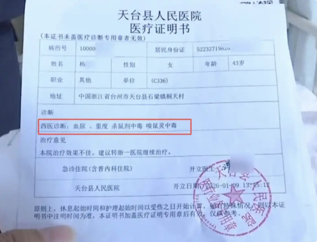1月12日,夫妇俩选择报警。警方检测了杨女士家中物品,从娃娃菜中检测出了老鼠药。随后,天台县公安局受理了杨女士夫妇报称的涉事电商商家“生产、销售有毒、有害食品案”。