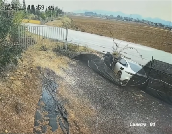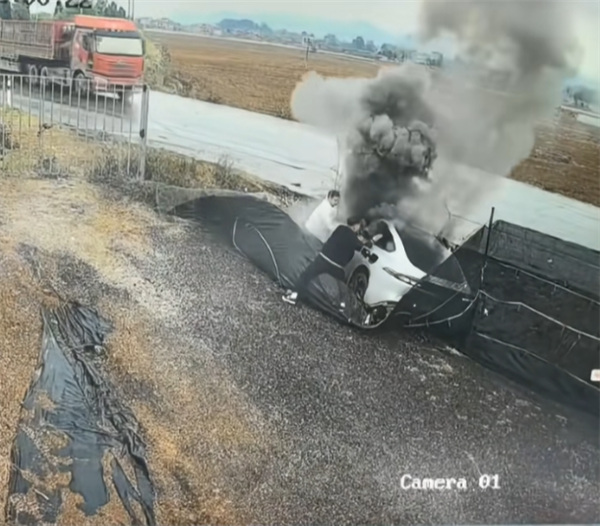 监控视频显示,周围都是田野,道路周围几乎没有建筑。中午11时59分,一辆白色轿车疑似失控,撞向路旁的护网。11时59分41秒,主驾驶位司机打开车门下车,车身开始冒起黑色烟雾。