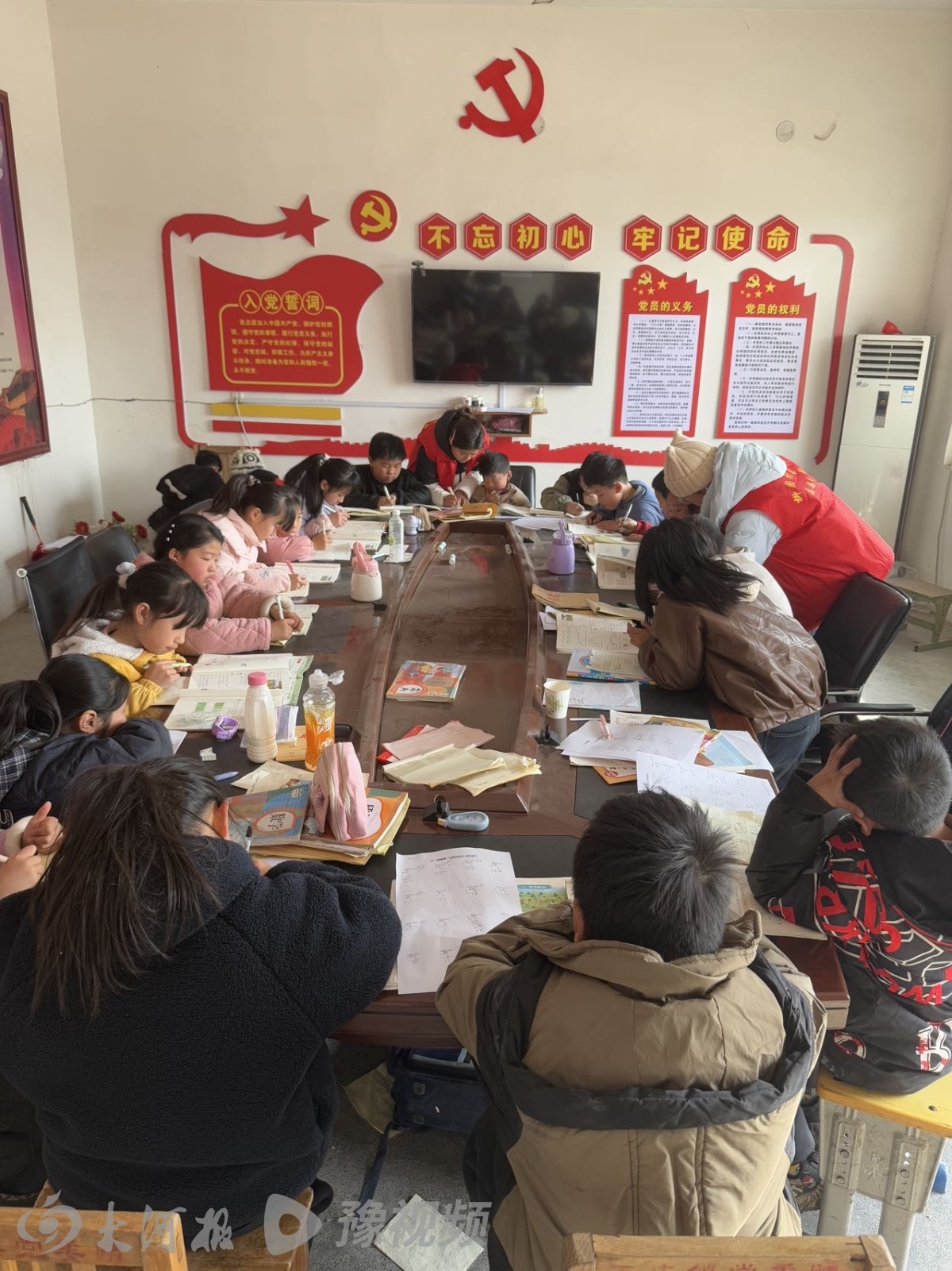 记者转了一圈发现,村委会两层小楼里,楼上楼下大大小小共有6个班,会议室、办公室等这些村“两委”班子办公的场所,此刻化身成暖意融融的学生课堂,孩子们或在读书,或在算题,或在写字,还有的在记单词,旁边几个大学生志愿者穿着红马甲,化身成热情的“老师”,给孩子们辅导功课,学习氛围十分热烈。