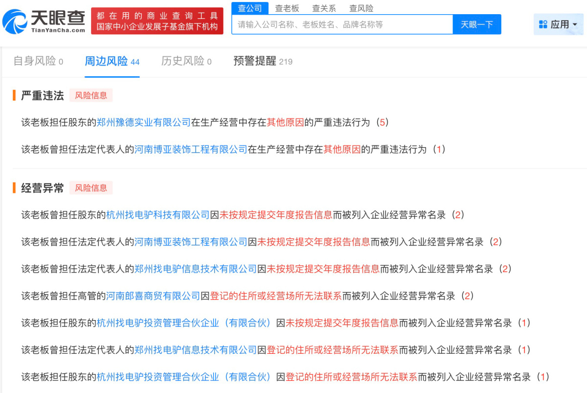 值得一提的是,冯雷冲持股的杭州找电驴投资管理合伙企业(有限合伙)等企业被多次列入经营异常名录。