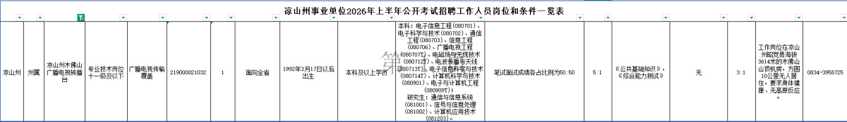 招聘公告显示,凉山州木佛山广播电视转播台拟招聘“广播电视传输覆盖”岗位人员1名,面向全省招考,要求报考人员为1992年3月17日及以后出生;本科要求电子信息工程、电子科学与技术、通信工程等专业,研究生要求通信与信息系统、信号与信息处理、计算机应用技术专业。