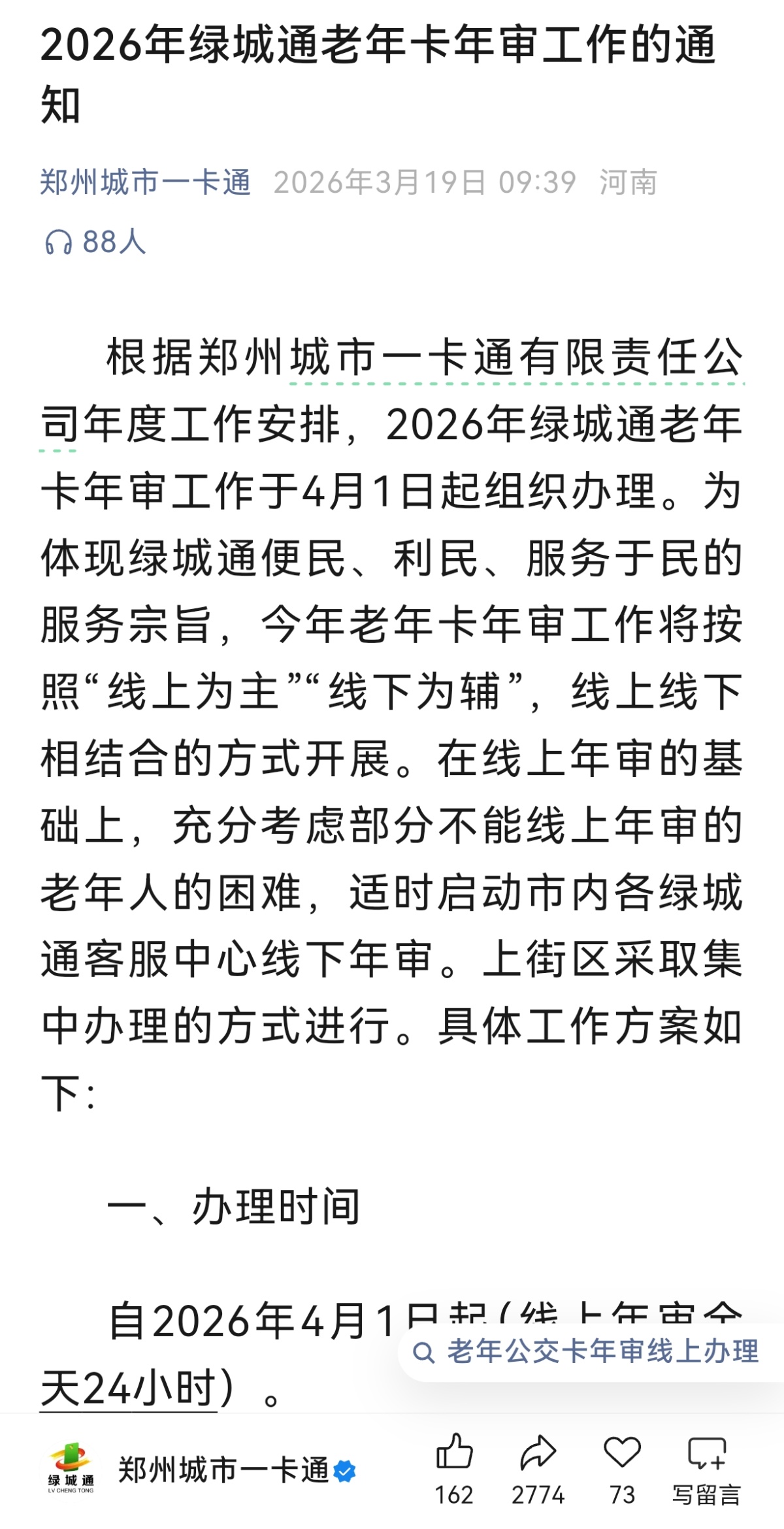 4月1日起,郑州绿城通老年卡开始年审