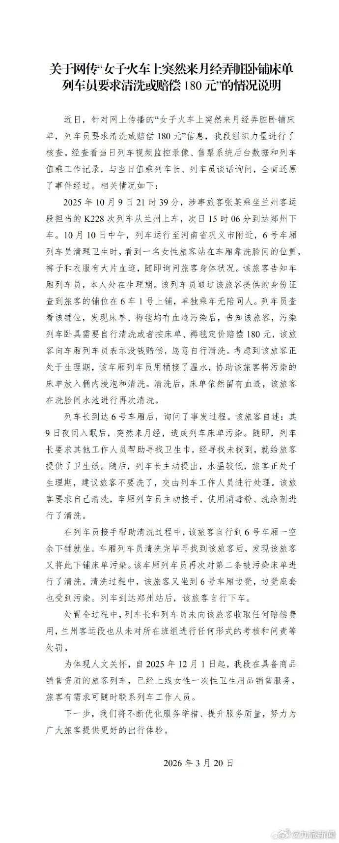 3月20日,@兰州客运段 发布情况说明:近日,针对网上传播的“女子火车上突然来月经弄脏卧铺床单,列车员要求清洗或赔偿180元”信息,我段组织力量进行了核查。经查看当日列车视频监控录像、售票系统后台数据和列车值乘工作记录,与当日值乘列车长、列车员谈话询问,全面还原了事件经过。相关情况如下 :