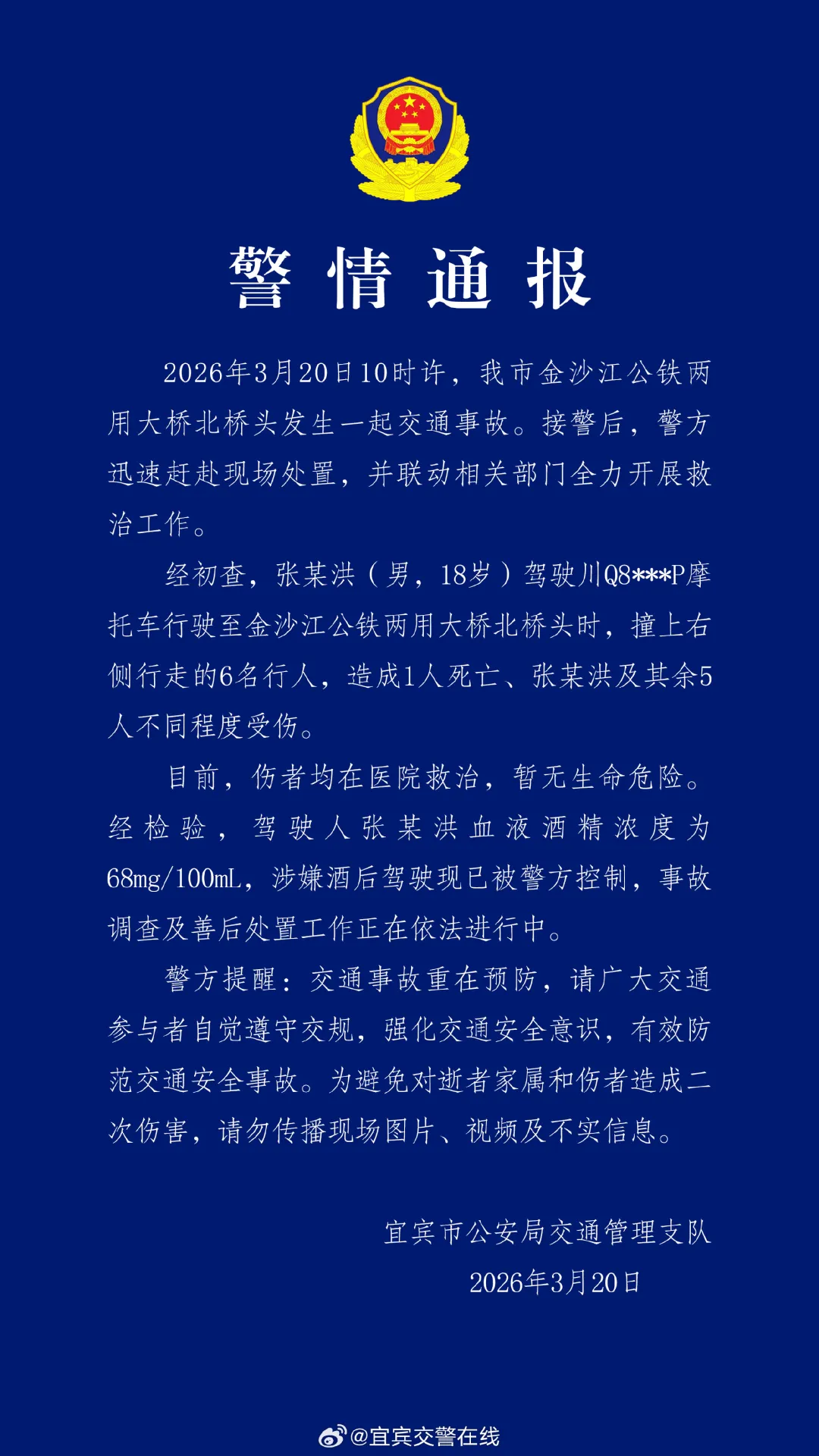 四川宜宾警方通报:张某洪(男,18岁),酒后驾驶摩托车撞上6名行人,致1人死亡,其本人及另外5人受伤,目前张某洪已被警方控制