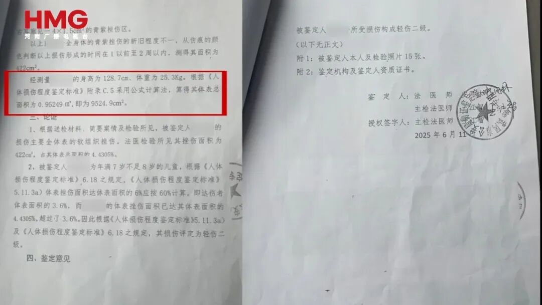 武冈市公安局出具的鉴定书显示:医生诊断测量孩子体表瘀青面积达 4522 cm² ,而小元宝体表总面积约为 9525 cm² 。瘀青面积超过了孩子体表总面积的 47% !