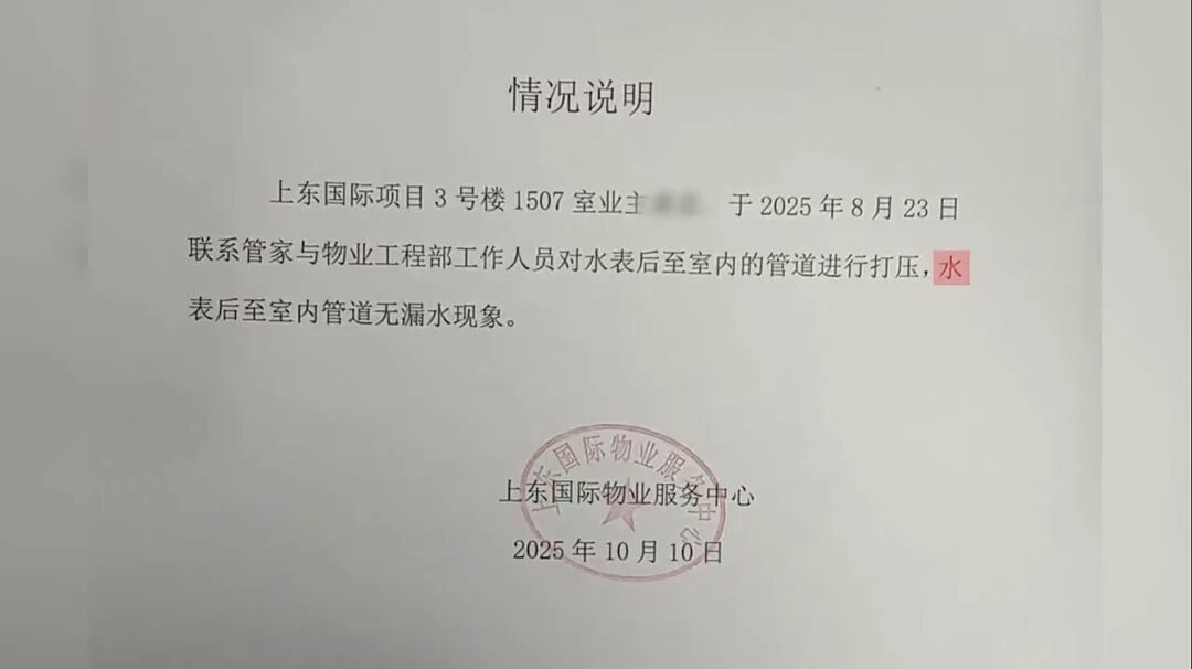 2025年8月13日,东区水务公司到盛女士家中进行检查后,工作人员认为巨额水费“跟水表没有关系”,并告知盛女士家的马桶漏水。对于这一说法,盛女士并不认同。她告诉记者,经过多次排查,家中没有发现任何漏水点,她还在8月23日请物业对家里的管道进行了打压检测。2025年10月10日,物业为盛女士出具了一份情况说明,表明盛女士家的水表后至室内管道没有漏水现象。