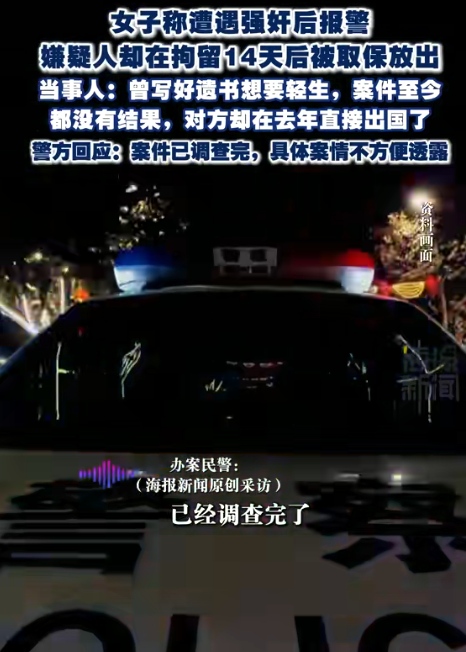 广州一女子称遭强奸后报警,嫌疑人拘留14天后被取保,“案件至今无结果,对方去年直接出国”;警方:案件已查完,详情不便透露