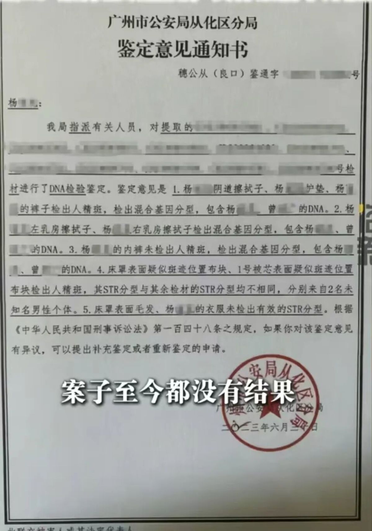 广东市公安局从化分局区出具的一份鉴定意见通知书显示:
