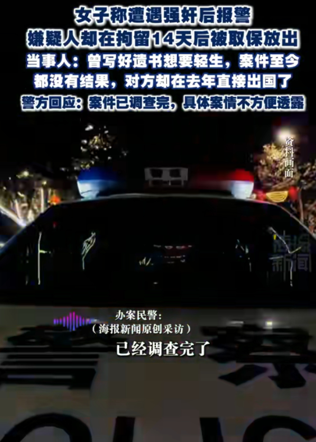 早前报道:广州一女子称遭强奸后报警,嫌疑人拘留14天后被取保,“案件至今无结果,对方去年直接出国”;警方:案件已查完,详情不便透露