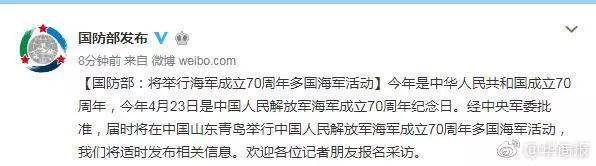 ▪今年是中华人民共和国成立70周年,今年4月23日是中国人民解放军海军成立70周年纪念日。经中央军委批准,届时将在中国山东青岛举行中国人民解放军海军成立70周年多国海军活动。