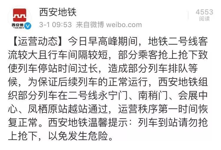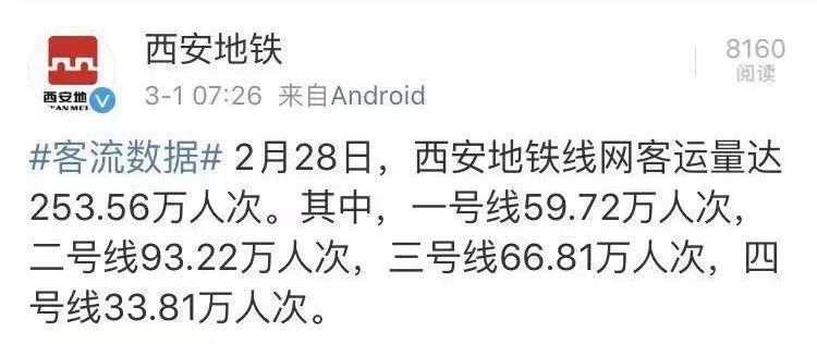 今天(3月1日)上午,西安地铁发布微博: