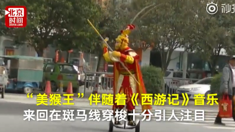 4月11日,郑州高新区,一个装扮成美猴王模样的男子伴随着《西游记》主题音乐,踏着平衡车在路口帮助老人过马路。男子管志军称,自己在旁边饭店门口做迎宾,饭店人少,路口繁忙时,他就到路口维持交通秩序,帮助大家安全过马路。