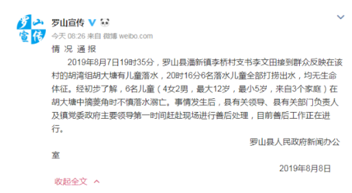 8日上午,记者从信阳市罗山县人民政府新闻办公室获悉, 8月7日19时35分,罗山县潘新镇李桥村支书李文田接到群众反映在该村的胡湾组胡大塘有儿童落水,20时16分6名落水儿童全部打捞出水,均无生命体征。经初步了解,6名儿童(4女2男,最大12岁,最小5岁,来自3个家庭)在胡大塘中摘菱角时不慎落水溺亡。事情发生后,县有关领导、县有关部门负责人及镇党委政府主要领导第一时间赶赴现场进行善后处理,目前善后工作正在进行。