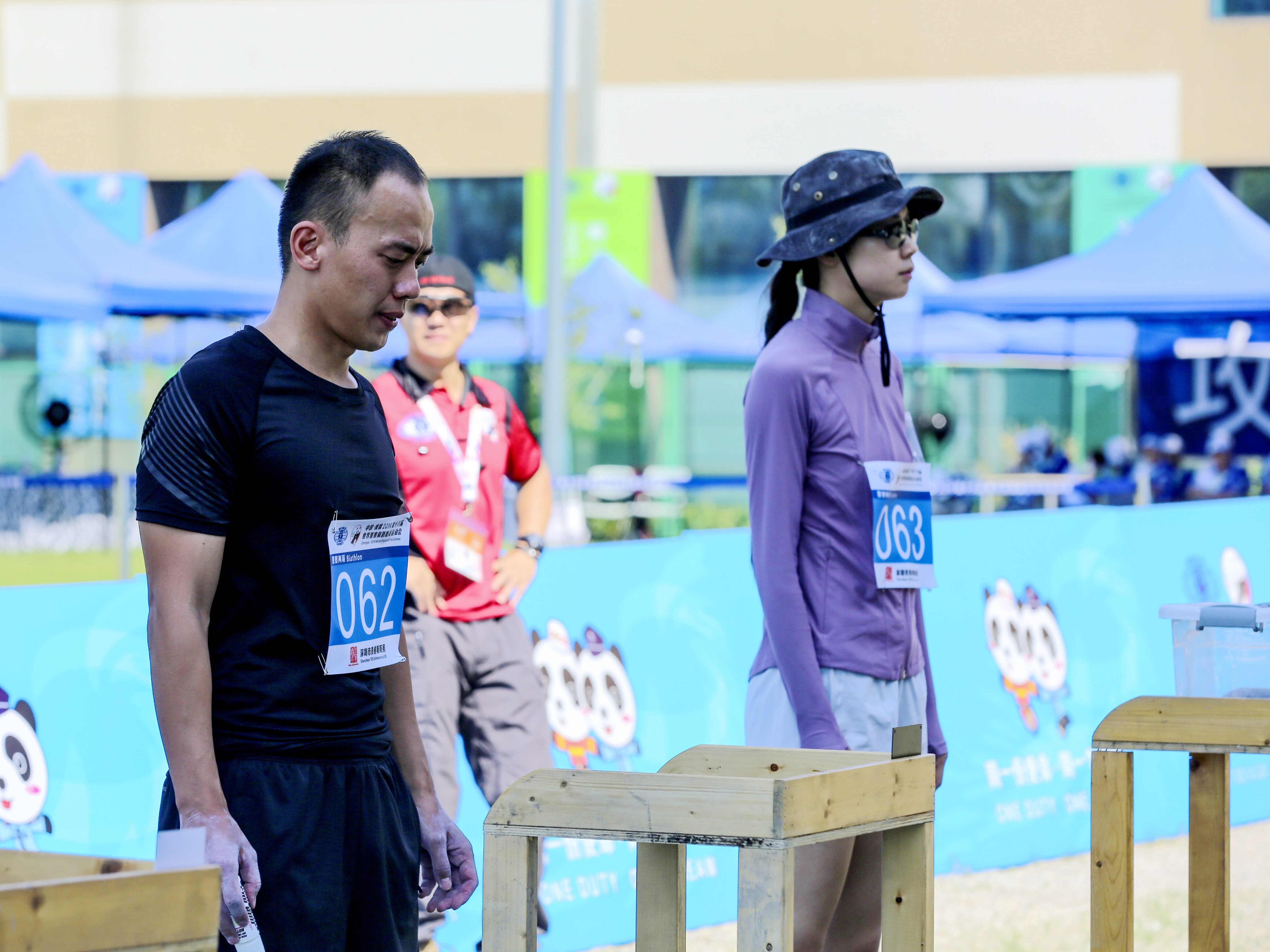 警察两项比赛是世界警察和消防员运动会独有的比赛项目,要求参赛选手先跑1英里(1.6公里),然后跑到靶位进行92G 手枪12发立姿无依托精度射击,接着跑完1英里,再射击12发子弹,最后进行1英里冲刺。
