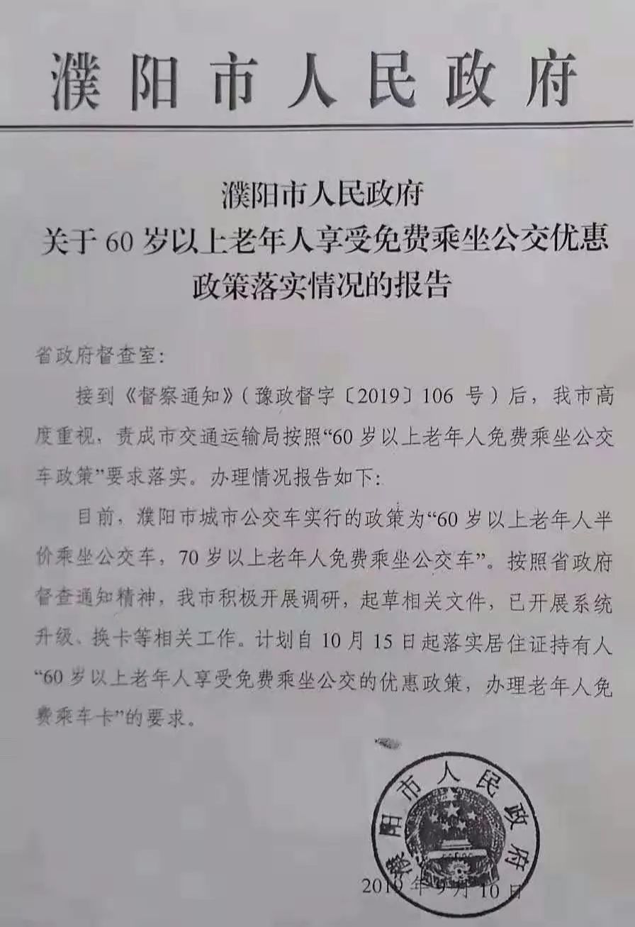 目前,濮阳市城市公交车实行的政策为60岁以上老年人半价乘坐公交车,70岁以上老年人免费乘坐公交车。按照省政府督查通知精神,我市积极开展调研,起草相关文件,已开展系统升级、换卡等相关工作,计划自10月15日起落实居住证持有人“60岁以上老年人享受免费乘坐公交车的优惠政策,办理老年人免费乘车卡”的要求。
