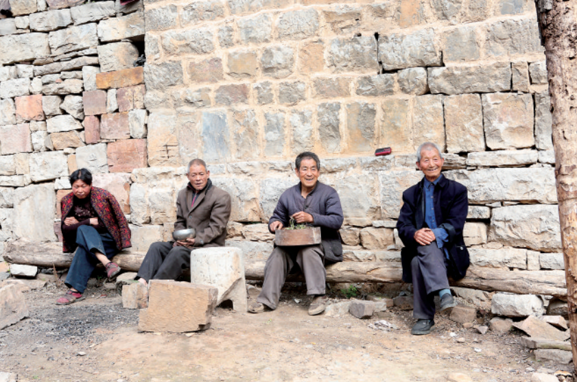一大一小两头驴子在悠闲散步,一个看家狗在门前晒着太阳,几只鸡在四处觅食。暖阳下,几位老人坐在桥头聊着天。