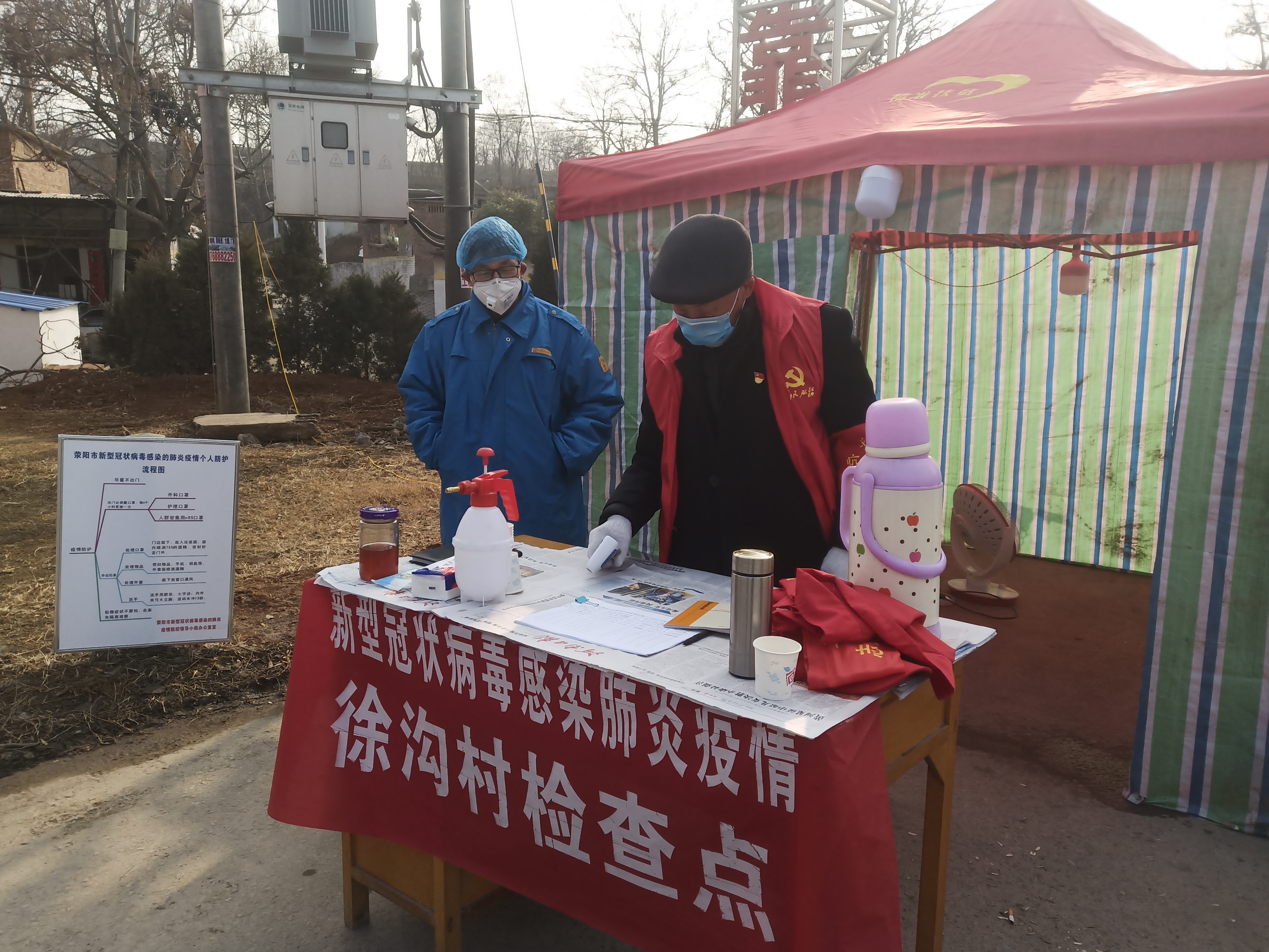 在荥阳市刘河镇徐沟村检查点,每天总能看到一位老人提着暖水瓶来卡点的身影,暖水瓶里装着刚在家煮好的绿豆水,老人一到卡点,就张罗着卡点人员喝点热水暖和下身子,自己默默替下值班人员在卡点做好来往人员登记工作,这位老人就是徐沟村年近70岁的老党员徐红安。