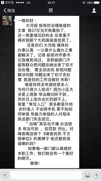 今天一早,最早向记者反映广告噪音污染的热心市民邓先生发来感谢信,表达对大河报·大河客户端关注民生、解决百姓难题的感激之情。
