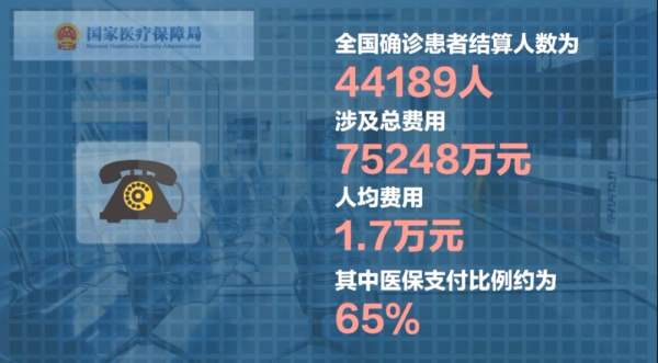 国家医保局医药服务管理司司长熊先军表示,截至3月15日,31个省(区、市)和新疆生产建设兵团报告,全国新冠肺炎确诊和疑似患者发生医保结算93238人次(包括门诊患者多次就诊结算),涉及总费用103960万元,医保系统共支付67734万元。全国确诊患者结算人数为44189人,涉及总费用75248万元,人均费用1.7万元,其中医保支付比例约为65%(剩余部分由财政进行补助)。