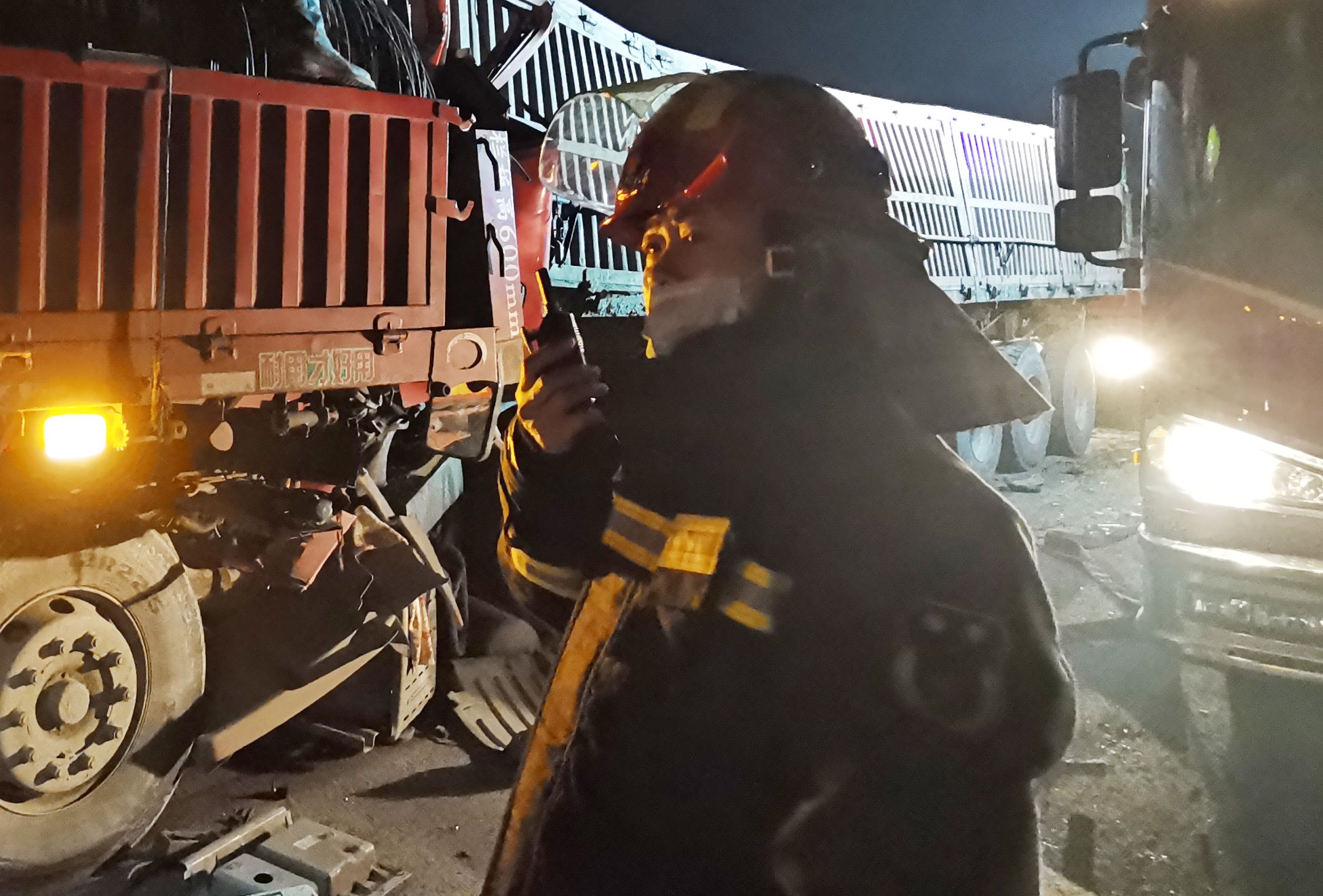 消防员在现场看到,宁洛高速558公里处,4辆挂车连环追尾,两名驾驶员被困;556公里处,两辆货车追尾,1名司机被困。3名司机均是浑身是血,身体多处受伤。特别是4车连环追尾现场,2名司机被困在变形的驾驶室,生命危在旦夕。更严重的是,6车油箱都已撞破,柴油遍地流淌。