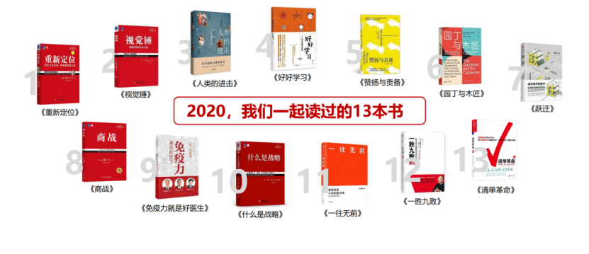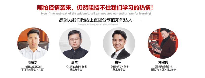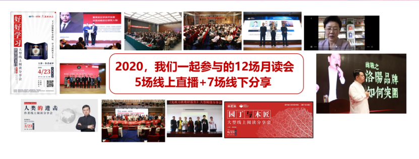我们的记者还记录下了这些生动的画面,构成一幅幅徐徐展开的美好图景:2020年,洛书会一起读过13本书:《人类的进击》、《好好学习》、《赞扬与责备》、《园丁与木匠》、《跃迁》、《免疫力就是好医生》、《一往无前》、《一胜九败》、《商战》、《重新定位》、《视觉锤》、《什么是战略》、《清单革命》。“事业有成很重要,但个人精进和家庭幸福更重要。家庭是企业家的出发点和最终归宿,唯有家庭幸福,企业才会健康,事业才能传承。” 周童会长说,2020年推荐的13本书基本上涵盖了这三个要义,2020年全年共举办了5场线上直播,7场线下分享。