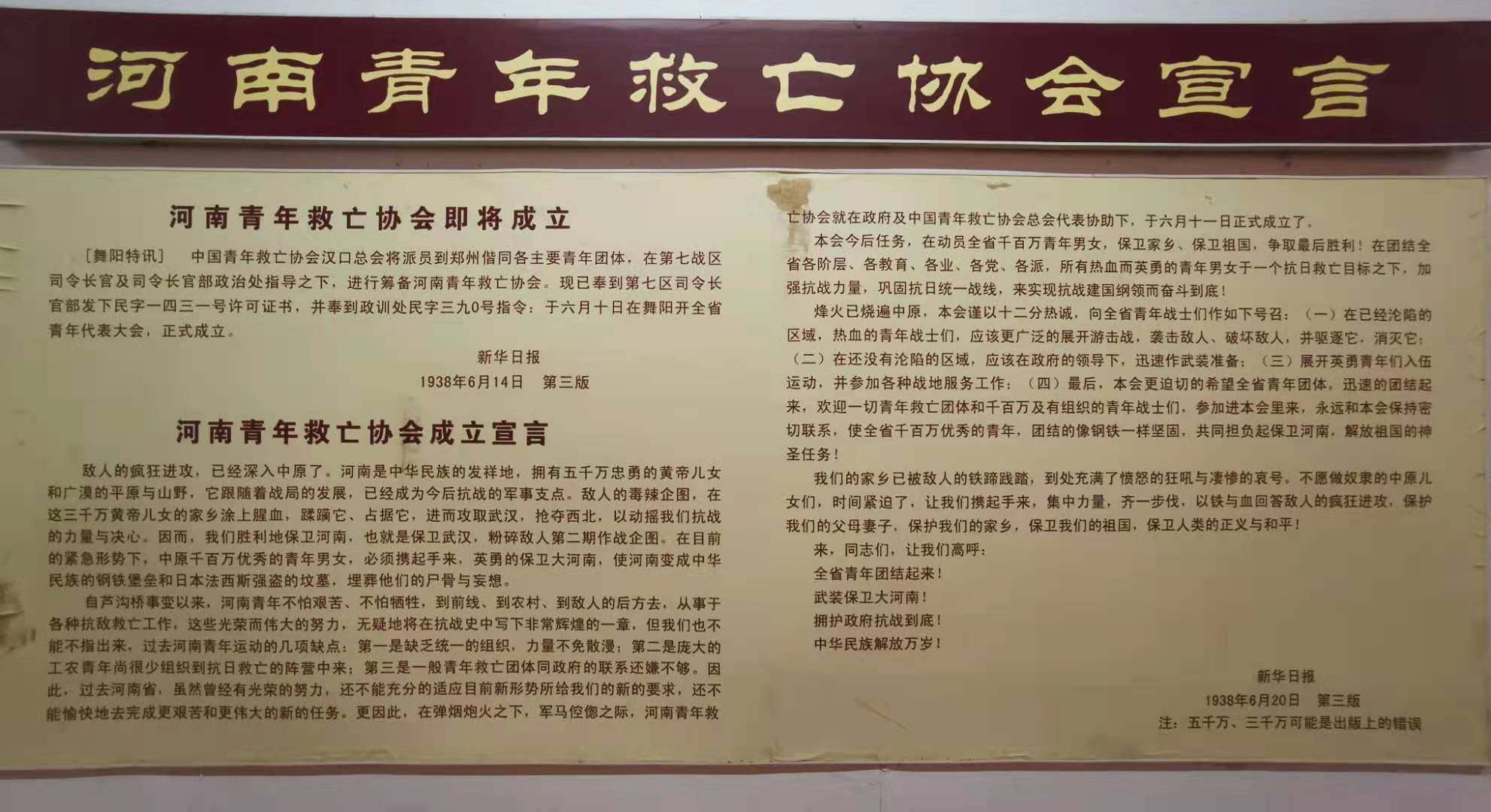 舞阳县博物馆副馆长康耀辉告诉记者,抗日战争爆发以后,除了抗日工作开展活跃的舞阳县青年救国会,河南广大青年在中共河南省委和各级党组织的直接领导下,在全省城乡纷纷建立抗日救亡团体,开展抗日救亡宣传活动,至1938年春,全省黄河以南已有53个县建立了青年救亡团体,形成了全省抗日救亡运动的一支重要生力军。