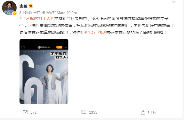 在整期节目录制中,我从正面的角度鼓励并提醒海外归来的学子们,回国后要脚踏实地的做事,把我们民族品牌怎样推向国际,向世界讲好中国故事!难道这样正能量的观点输出,对你们#江苏卫视#来说是有问题的吗?请做出解释!