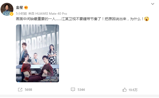 12月30日,金星秀主持人金星发布一张海报怒怼某卫视:画面中间缺最重要的一人……江某卫视不要瞎带节奏了!把原因说出来,为什么!