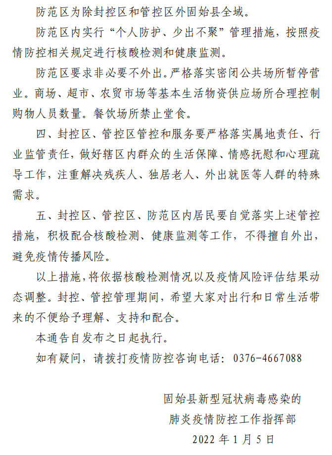 2022年1月5日,固始县新型冠状病毒感染的肺炎疫情防控工作指挥部发布《关于对我县部分区域实行分类管理的通告》。内容如下: