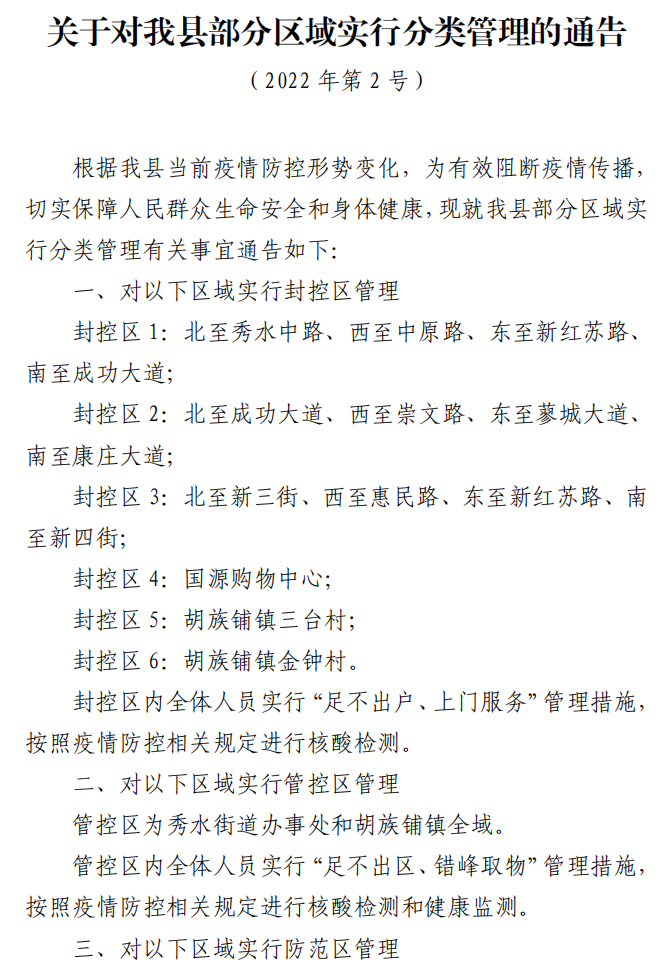 根据我县当前疫情防控形势变化,为有效阻断疫情传播,切实保障人民群众生命安全和身体健康,现就我县部分区域实行分类管理有关事宜通告如下: